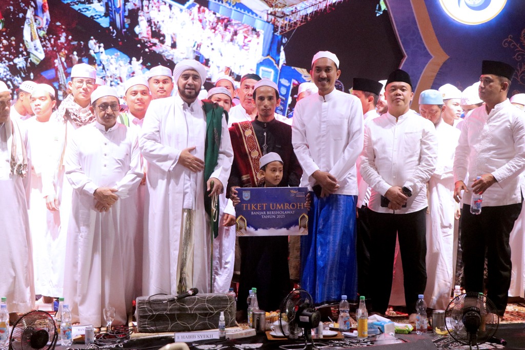 Martapura, – Dalam rangka memperingati Hari Ulang Tahun ke-80 Republik Indonesia dan Hari Jadi ke-75 Kabupaten Banjar, Pemerintah Kabupaten (Pemkab) Banjar kembali menggelar Banjar Bersalawat bersama Habib Syech bin Abdul Qadir Assegaf, di Ruang Terbuka Hijau (RTH) Alun-Alun Ratu Zalecha, Martapura, Sabtu (23/8/2025) malam.
