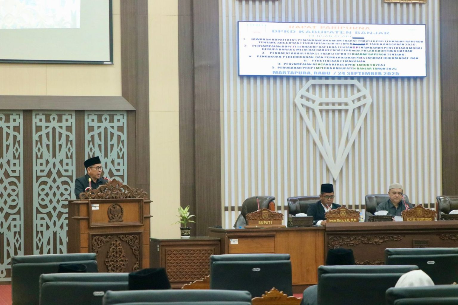Rapat ini dipimpin Wakil Ketua I DPRD Banjar H Irwan Bora, didampingi unsur pimpinan lainnya dan dihadiri Forkopimda serta pejabat daerah, termasuk Pj Sekda Banjar H Ikhwansyah.