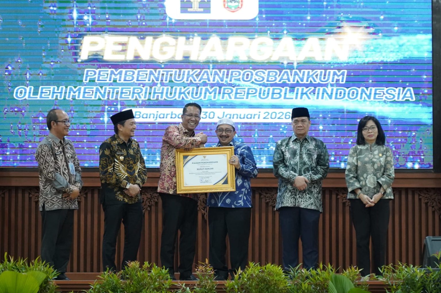 BANJARBARU – Pemerintah Kabupaten Banjar menerima Piagam Penghargaan dari Kementerian Hukum (Kemenkum) RI yang telah mendukung pembentukan Pos Bantuan Hukum (Posbankum) Desa/Kelurahan di Kabupaten Banjar.